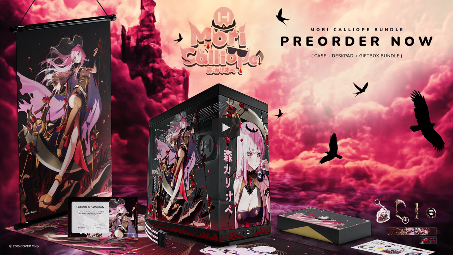 With Rosuuri's artwork, I spearheaded the first collab piece for Hakos Baelz. This included a custom PC case design, collaboration logo, packaging and a mousepad that I personally designed and followed through the production process. The success of the sold out Hakos case green lit a continued partnership that has continued into 2026 and beyond.